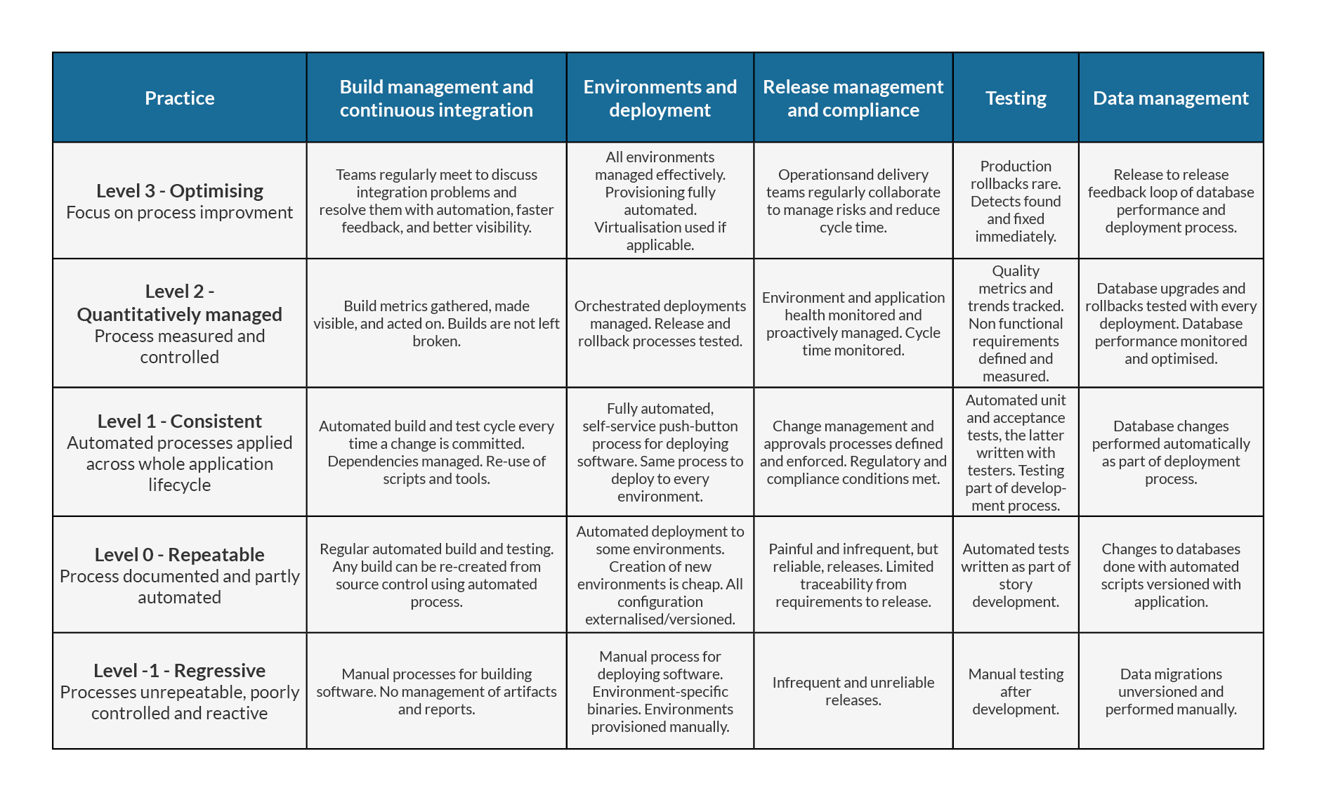 A quick dive into Google brings up a large number of options and most will look something like this. It’s a matrix that’s useful for determining how mature you are across a number of agile practices and what you can do to progress to the next level. However, it does also have its flaws: it’s subjective, only offers a partial solution and doesn’t really tell you ‘why’.