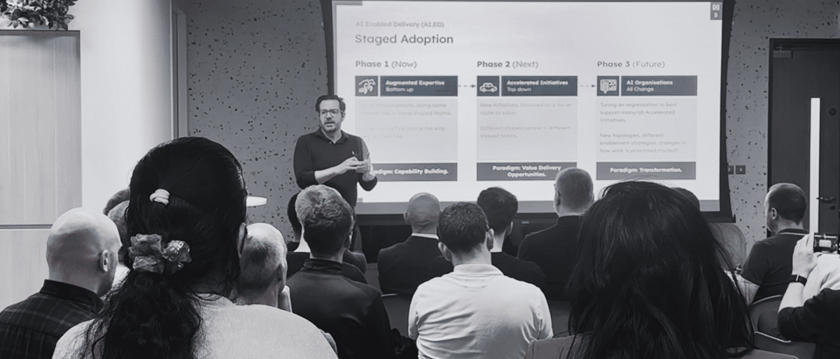 At a couple of these events, we shared a simple “staged adoption” model for AI Enabled Delivery—from small, bottom-up experimentation to full-blown organisational transformation. Lots of people found it useful for clarifying where they are and where they’d like to be.